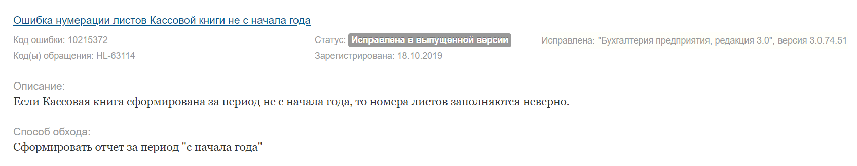 Несколько ошибок видела. Вот такая "Если Кассовая книга сформирована за период не с начала года, то номера листов заполняются неверно". Починили в 3.0.74.51. Еще такая "При формировании отчета Кассовая книга в первый раз выдается сообщение об ошибке". Починили в 3.0.74.58. Такая ошибка "Номера листов кассовой книги отличаются от ранее сформированных". Сказали обновиться до 3.0.75. |