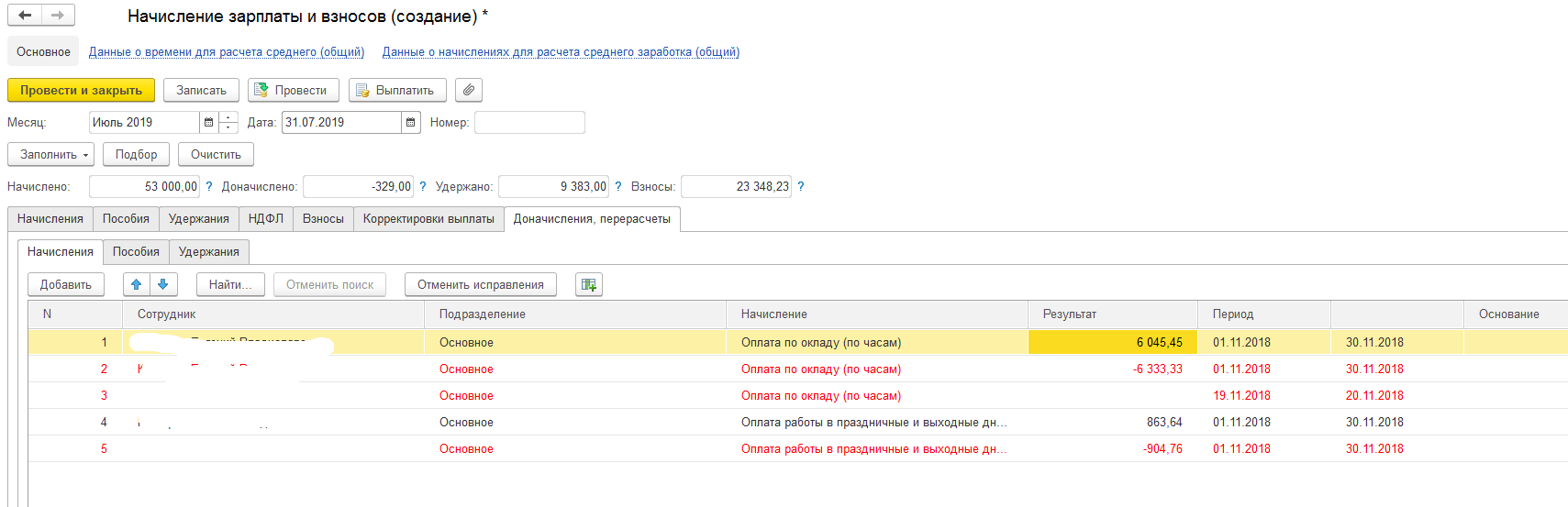 Добрый день! По ЗУПу, в июне месяце по сотрудникам был отпуск, с середины июня, делаю расчет ЗП, и программа автоматически считает неверную оплату по окладу. Плюс ко всему второй строкой делает персональную надбавку на эту же сумму (неверно рассчитанного оклада). Во вкладке доначисления/перерасчеты по сотруднику идут непонятные персональные надбавки в ряд, за период сначала года, хотя они не начислялись у него. Подскажите в чем может быть дело?