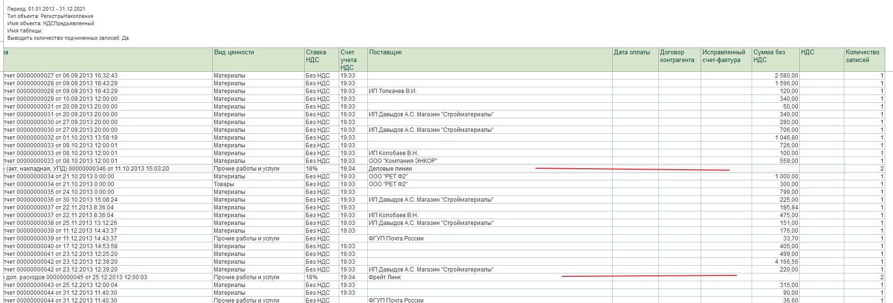 Странно. Я почему смутилась этой суммой: по другим ведь документам, где не висит остаток по НДС, суммы ведь в отчёте присутствуют! Значит они должны быть? А по этим выйдет пустая строка. если суммы без НДС тоже трогать