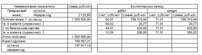ну и еще возможно, что остаток аванса по неправильному отчету был сдан и оприходован в кассу, потом выдали миллион рублей, вот и вылазит перерасход 2125.60, а это как раз разница между 736840.02 - 734714.42 = 2125.60