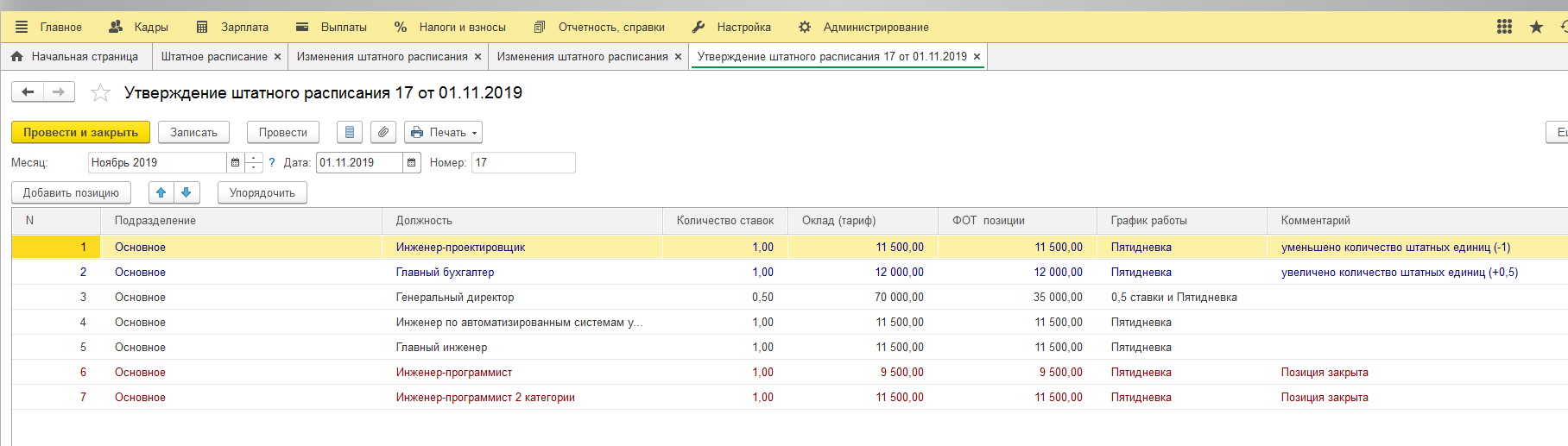 Всё нормально делается. ЛюдмилаИАП, у вас нет несколькиз штатных! У вас несколько одинаковых позиций в одном штатном. я выбрала пункт "Утвердить новое штатное" в открывшемся окне сделала все необходимые изменения. Заменила ставку с 0,5 на 1, на должностях, с которых уволены сотры и пока никого - нажала делит, и позиция закрылась.
