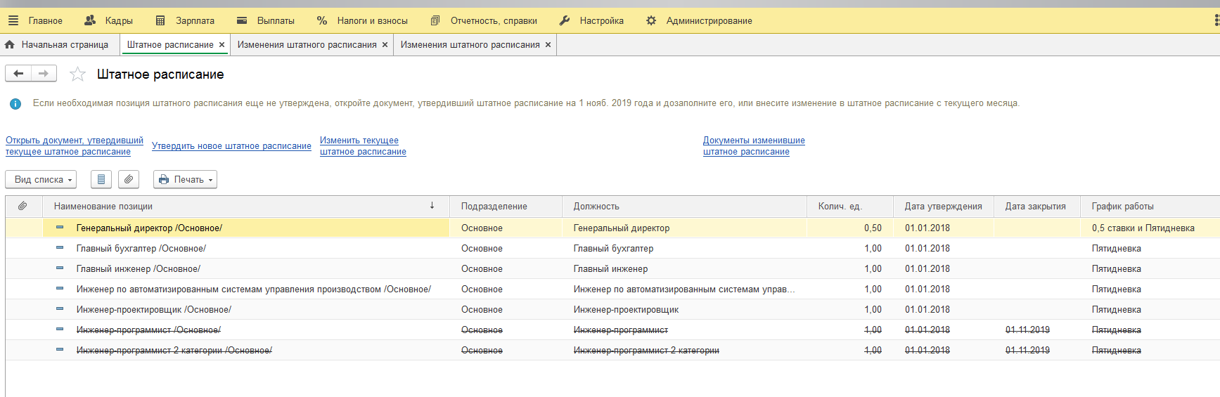 Спасибо за помощь. Я закрою лишние позиции. Единственное не пойму что делать со старым штатным расписанием, потому как после закрытия, у меня останется 2 штатных расписания : 1) с 2013 года по 1.10.2019 год. с окладом 20000 руб ; 2) и второе новое с 1.10.2019 г. с окладом 22000 руб.