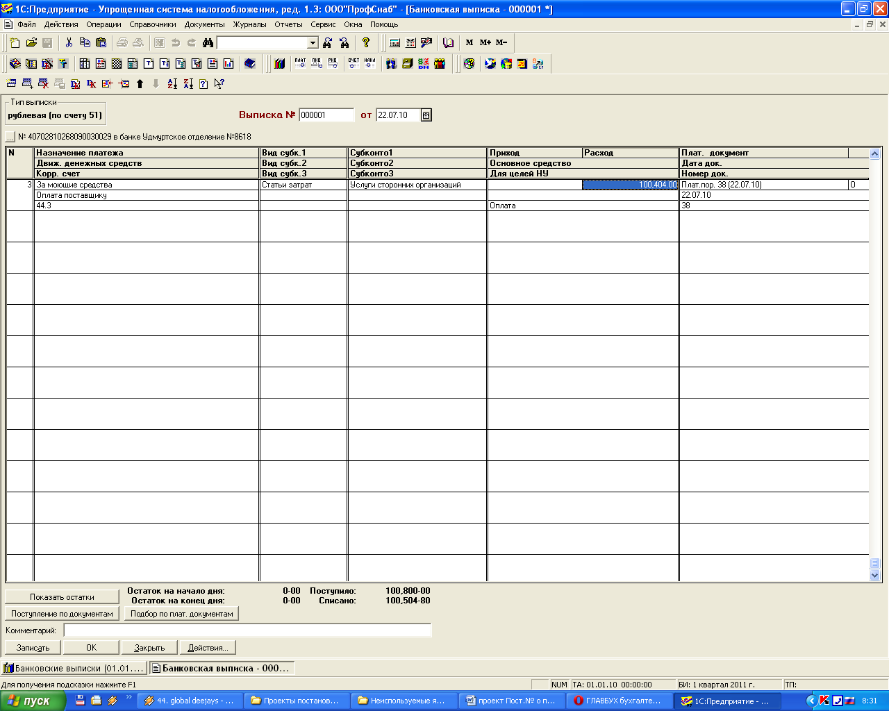 сначала несколько вопросов.Какой счет ставите в выписке,какой вид расходов в субконто 3 выбираете,что было раньше-оплата или оприходование..Если оплата была за материал,тогда будет учитываться расход при оприходовании материала ( Поступление МПЗ), причем по дате ,более поздней из двух-оплата или оприходование.Если платили за товар,тогда расход будет учитываться при проведении документа реализации покупателю этого товара. Если документы вносились не в хронологическом порядке,,что-то вносилось задним числом,например, имеет смысл перепровести документы оплат,оприходований и реализаций в групповом режиме Сервис-Обработка документов. |