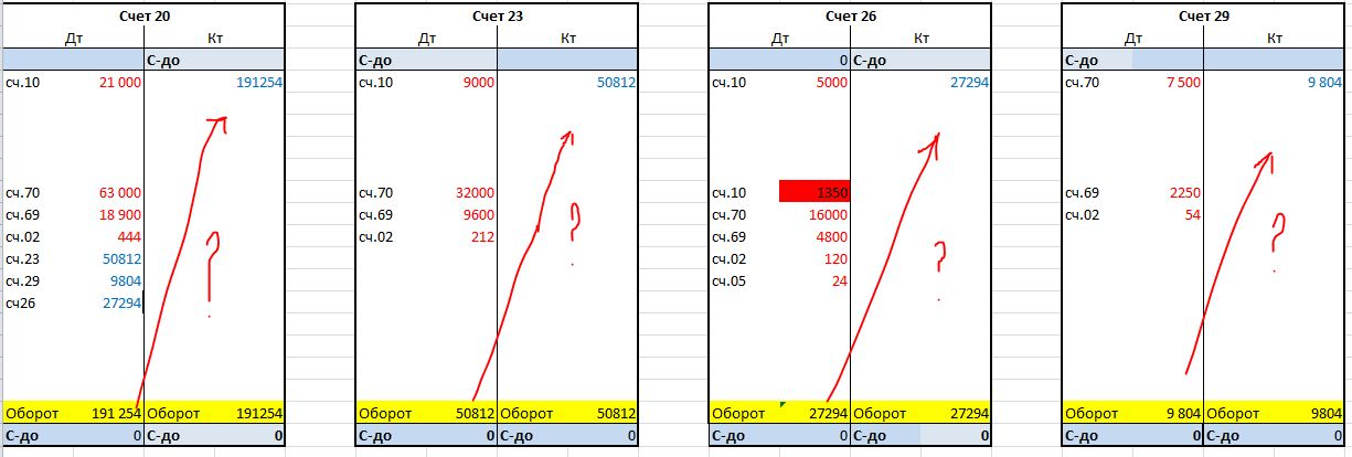 Lilysha, Вот пока вы не сделаете все пункты и не раскидаете все, нет смысла вообще выкладывать Журнал, самолетики и оборотку. Потому что вы сами будете путаться, оборотно-сальдовую ведомость нужно заполнять только после того, как все самолеты уже сделаны, в самолетках выведены все обороты. О сальдо на начало периода и сальдо на конец периода мы сейчас не ведем речь и не заполняем, мы сейчас заполняем только обороты. Поэтому сначала журнал операций весь, потом самолеты все, а потом уже обортно-сальдовую ведомость. У меня задача решена полностью. Оборотку я заполняю только после самолетов, и если оборотка "не бьется", т.е. суммы итого по Дт не равны с Кт, то это означает, что где-то ошибка, и вот тогда уже начинаем искать ошибку, либо проводку не правильно сделала, либо в самолетах не правильно цифры разнесла. Для того чтобы было удобно делать, сначала журнал заполните и либо его распечатайте, либо на этом же листе рядом с журналом разместите самолетики, чтобы удобно было. И начинаете с первой строчки разносить. Потом внимательно проверяете, так же с первой строчки, я когда проверяю, то то что проверила, разнесла и убеждена, что сделала правильно эти строки и эти цифры выделяю каким нибудь цветом, если журнал распечатан, то ставлю галки, что это проверено и разнесено туда куда надо.