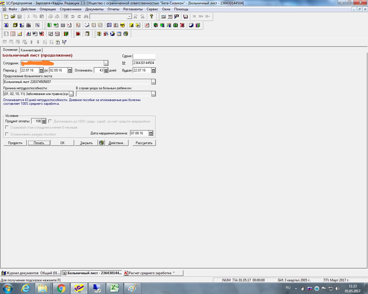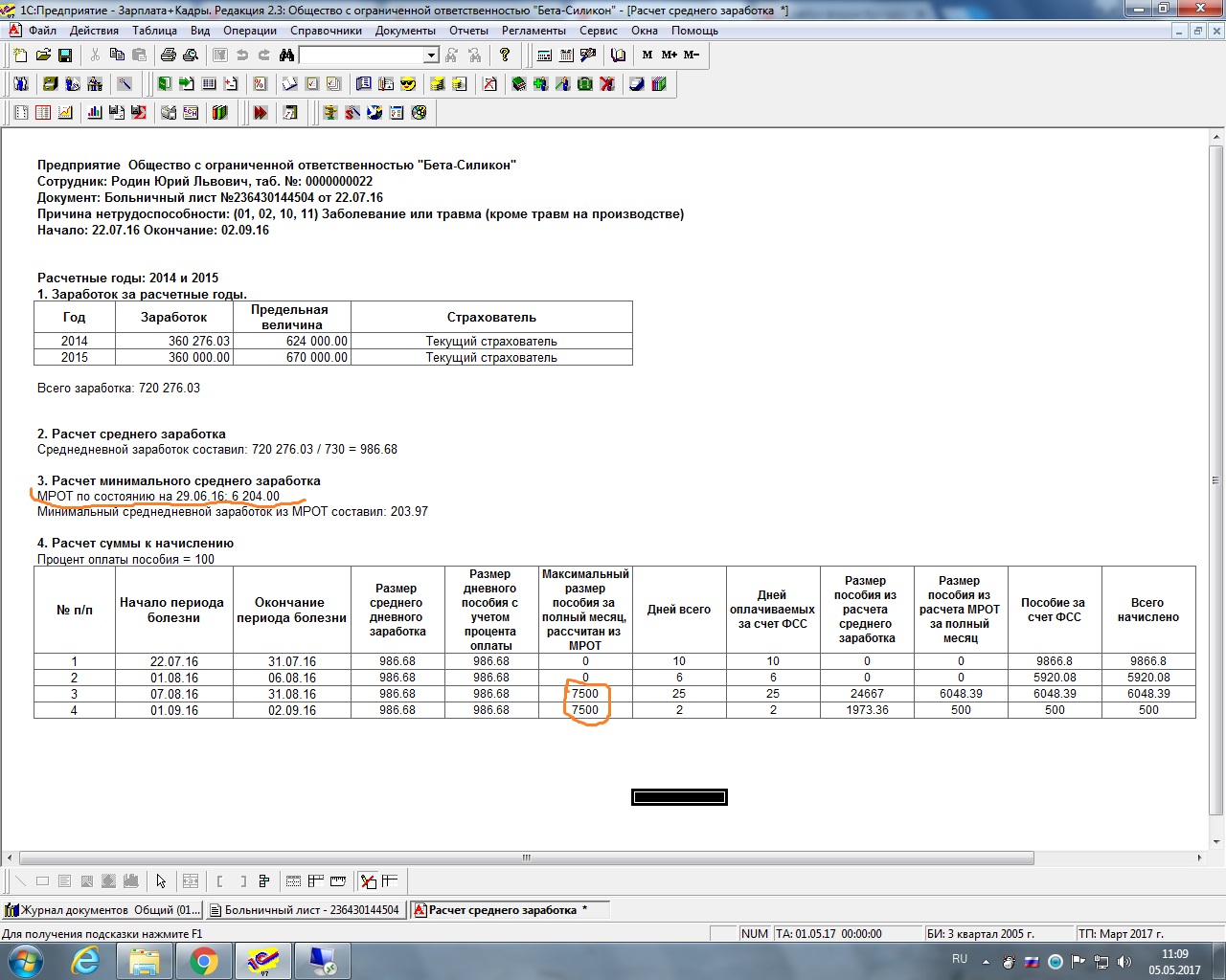 Здравствуйте! Помогите разобраться. Ситуация такая: есть больничный лист от 29.06.16 (МРОТ на этот момент 6204 руб), далее продолжение этого б/л от 22.07.16 (МРОТ 7500 руб), в котором стоит отметка о нарушении режима от 07.08.16, с этой даты программа Зарплата и кадры рассчитывает пособие по МРОТу 7500 руб, а должна по 6204, т.к. это продолжение б/л. Что нужно сделать, чтобы расчет был сделан верно?