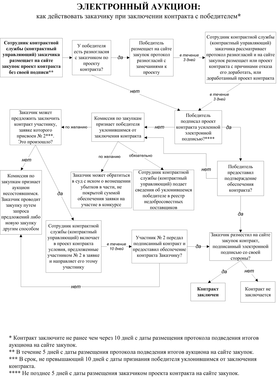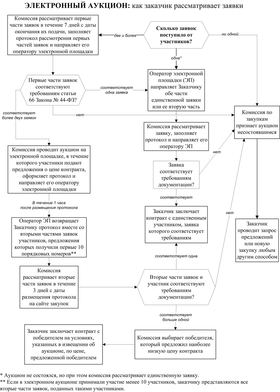[свернуть] Заявка на участие в торгах состоит из двух частей. Первая содержит только согласие на участие и информацию о предмете тендера. Для анонимности в данной части не указывают наименование претендента. Минимум, что должна содержать вторая часть заявки: -ИНН и наименование организации или Ф. И. О. индивидуального предпринимателя (ИНН учредителя); -документы, подтверждающие соответствие требованиям Закона № 44-ФЗ; -копии документов, подтверждающих соответствие товара, работы или услуги требованиям, установленным в соответствии с законодательством РФ; -решение об одобрении или о совершении крупной сделки; документы, подтверждающие право участника на получение преимущества (для учреждений уголовно-исполнительной системы и организаций инвалидов); -декларацию о принадлежности участника к субъектам малого предпринимательства или социально ориентированным некоммерческим организациям. Заявку в бумажном виде (при конкурсе, запросе котировок) нужно доставить заказчику в запечатанном конверте (курьером, почтой, лично). В электронном – загрузить через ЭТП либо отправить на электронную почту заказчика (если это допустимо), заверив электронной подписью. 3. Подготовка финансовых гарантий Госзаказчики требуют финансовую гарантию того, что победитель тендера подпишет договор. Обеспечением могут быть как денежные средства, так и банковская гарантия. Последнюю можно получить в уполномоченных банках (их перечень есть на официальном сайте Минфина России). Сумма обеспечения составит от 0,5 до 5 процентов от начальной (максимальной) цены контракта. Ее организации вернут в течение пяти рабочих дней после подведения итогов. А, например, при электронном аукционе оператор электронной торговой площадки разблокирует средства за один рабочий день. Но следует помнить, что обеспечение не вернут, если организация-победитель уклонилась от заключения контракта. Учтите и такой важный нюанс. Если в течение квартала на одной ЭТП заявка участника будет отклонена по второй части три раза, обеспечение заявки по последнему отклонению будет переведено на расчетный счет заказчика (ч. 27 ст. 44 Закона № 44-ФЗ). 4. Надо соблюсти установленные сроки При проведении конкурса или запроса котировок в конкретный день собирается комиссия госзаказчика. Ее члены вскрывают все конверты, затем в течение установленного срока определяют победителя. Любой участник имеет право присутствовать при данной процедуре. Если организация участвует в электронном аукционе, то после получения допуска в указанный день необходимо перейти в аукционный зал на электронной площадке, где проводится закупка. На площадке компания подает свои ценовые предложения. Аукцион проходит в два этапа. На первом снижают начальную цену контракта. При этом предложения подают в пределах шага аукциона. На втором этапе участники могут улучшить свои ценовые предложения, кроме назвавшего лучшую цену. Максимальное время, отведенное на один шаг на электронном аукционе, – 10 минут. А величина снижения НМЦК – от 0,5 до 5 процентов. После окончания торгов оператор ЭТП направит заказчику результаты. Специальная комиссия рассмотрит вторые части заявок. Если заявка лидера первого этапа будет признана соответствующей требованиям, именно с ним и подпишут контракт. В противном случае победителем могут признать 