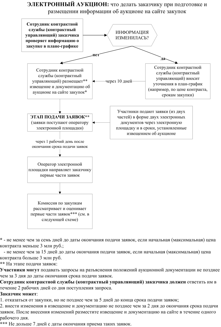 Электронный аукцион (аукцион в электронной форме) — способ определения поставщика (подрядчика, исполнителя), при котором торги проводятся на специальном сайте (электронной площадке), а победителем становится тот, кто предложит наименьшую цену контракта (ч. 4 ст. 24, ч. 1 ст. 59 Закона 44-ФЗ). Обязанность проводить электронный аукцион возникает у заказчика, в случае если осуществляются закупки товаров, работ, услуг, включенных в перечень утвержденный Правительством РФ от 31 октября 2013 г. № 2019-р. Схема 1: Основные этапы проведения аукциона ![]() Аукционы проводятся на электронных площадках, отбор которых осуществляется Минэкономразвития России совместно с ФАС России сроком на пять лет. По результатам отбора операторов электронных площадок Правительством Российской Федерации определяется перечень таких операторов. Основные площадки представлены на официальном сайте (рис. 1): Рис.1: Электронные площадки ![]() Решение о проведении аукциона принимает заказчик, а при централизации закупок — уполномоченный орган или уполномоченное учреждение (ч. 5 ст. 24, ст. 26 Закона № 44-ФЗ). Перед проведением аукциона в электронной форме создайте комиссию по проведению закупок. При этом заказчик вправе создать как специализированную аукционную комиссию, так и единую комиссию, уполномоченную определять поставщика любыми способами (ст. 39 Закона № 44-ФЗ). До создания единой информационной системы заказчик или уполномоченный орган, уполномоченное учреждение должны размещать извещение о проведении электронного аукциона на официальном сайте . Заказчик не менее чем за 15 дней до даты окончания подачи заявок размещает извещение об электронном аукционе, если начальная цена контракта выше 3 млн. руб.. Если же начальная цена контракта не превышает 3 млн. руб., то извещение допускается размещать не менее чем за семь дней (ч. 2, 3 ст. 63 Закона № 44-ФЗ). В дополнение к официальному сайту заказчик или орган, уполномоченный на проведение централизованной закупки, могут опубликовать извещение об аукционе в любых средствах массовой информации (включая электронные). Но подобная публикация не отменяет размещение на официальном сайте (ч. 4 ст. 63 Закона № 44-ФЗ). Далее смотрим вложения. Электронный аукцион от А до Я. Номер №1 Журнала "Госзакупки в учреждениях" июль 2015г. 5 шагов: Как провести электронный аукцион ![]() 5 шагов: Как принять участие в электронном аукционе