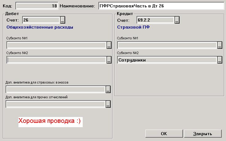 Но осталось одна цифра, упорно не попадающая в нужную строчку. Методом дедукции и интерполяции было выяснено, что эта цифра - страховая часть пенсии. И формируется она определенной проводкой. Проводка эта не правильная какая то. Вроде бы есть более хорошая проводка в списке шаблонов проводок. Только нужно как то сказать 1Ске, чтоб она импользовала ту другую, а не это плохую. Как это сделать ? Последний раз редактировалось ZugDuk; 23.03.2010 в 15:46. |