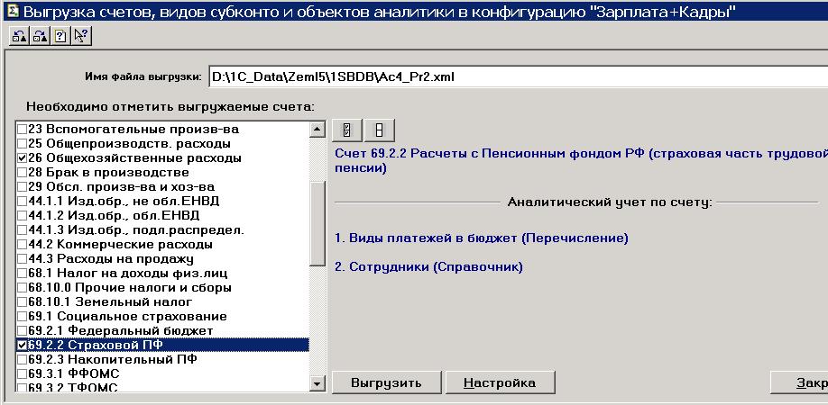 1. Открываем базу 1С Бухгалтерия. Выбираем обмен данными с ЗиК. В списке счетов отмечаем только те, что касаются задаче (в моем случае цель была получить проводку 69.2.2 в 26). Выгружаем. Получаем xml файлик.