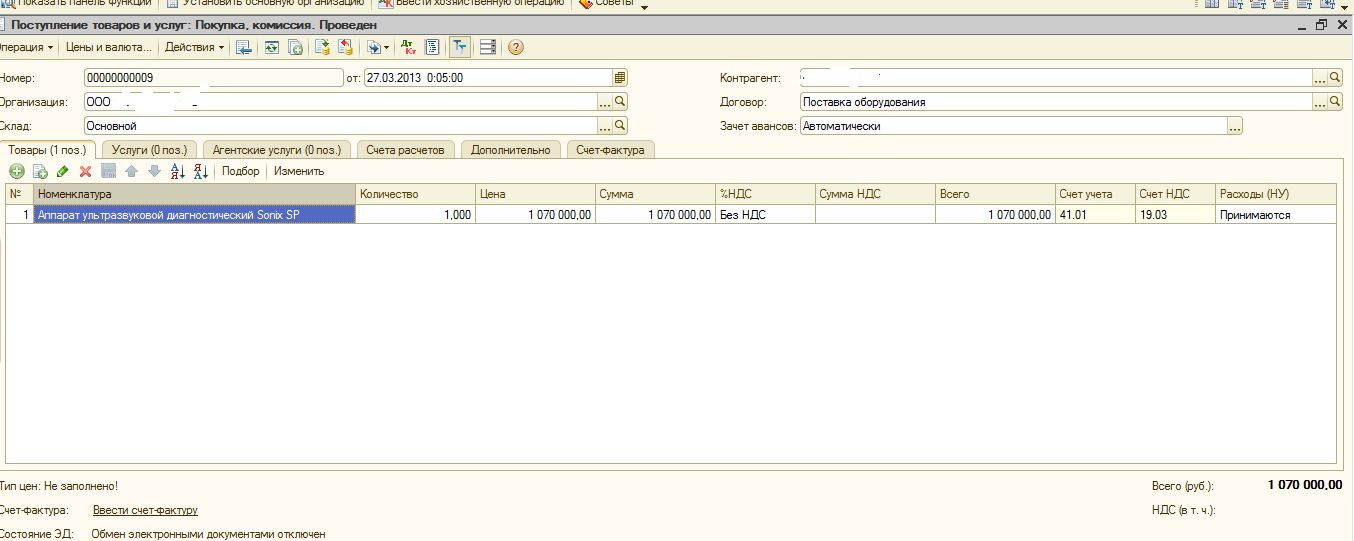 Выкладываю скрин документа "поступление товаров, услуг". Внизу указано "тип цен- не заполнено!" Смущает, на самом деле всё заполнено!!!