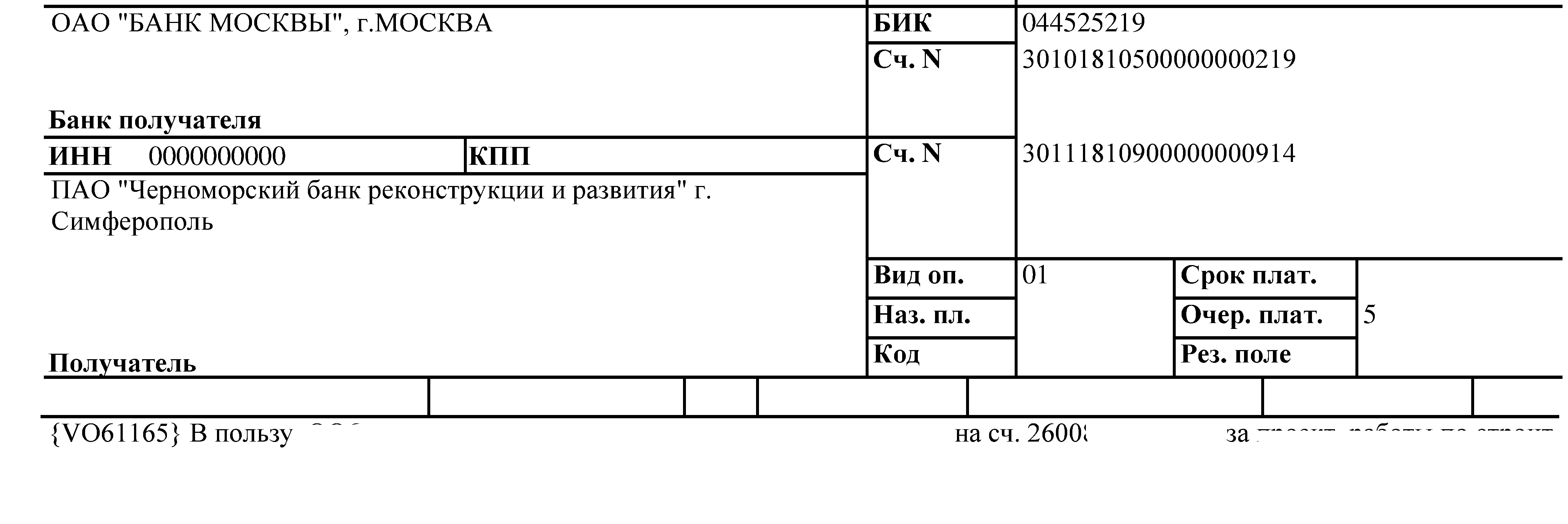 Образец платежки из российского банка (например РНКБ) на счет в ЧБРР через кор. счет. В назначении платежа {VO61165} - российский код валютного платежа для оплаты работ услуг, для нестандартного нужно искать. Последний раз редактировалось аек; 23.05.2014 в 13:41. |