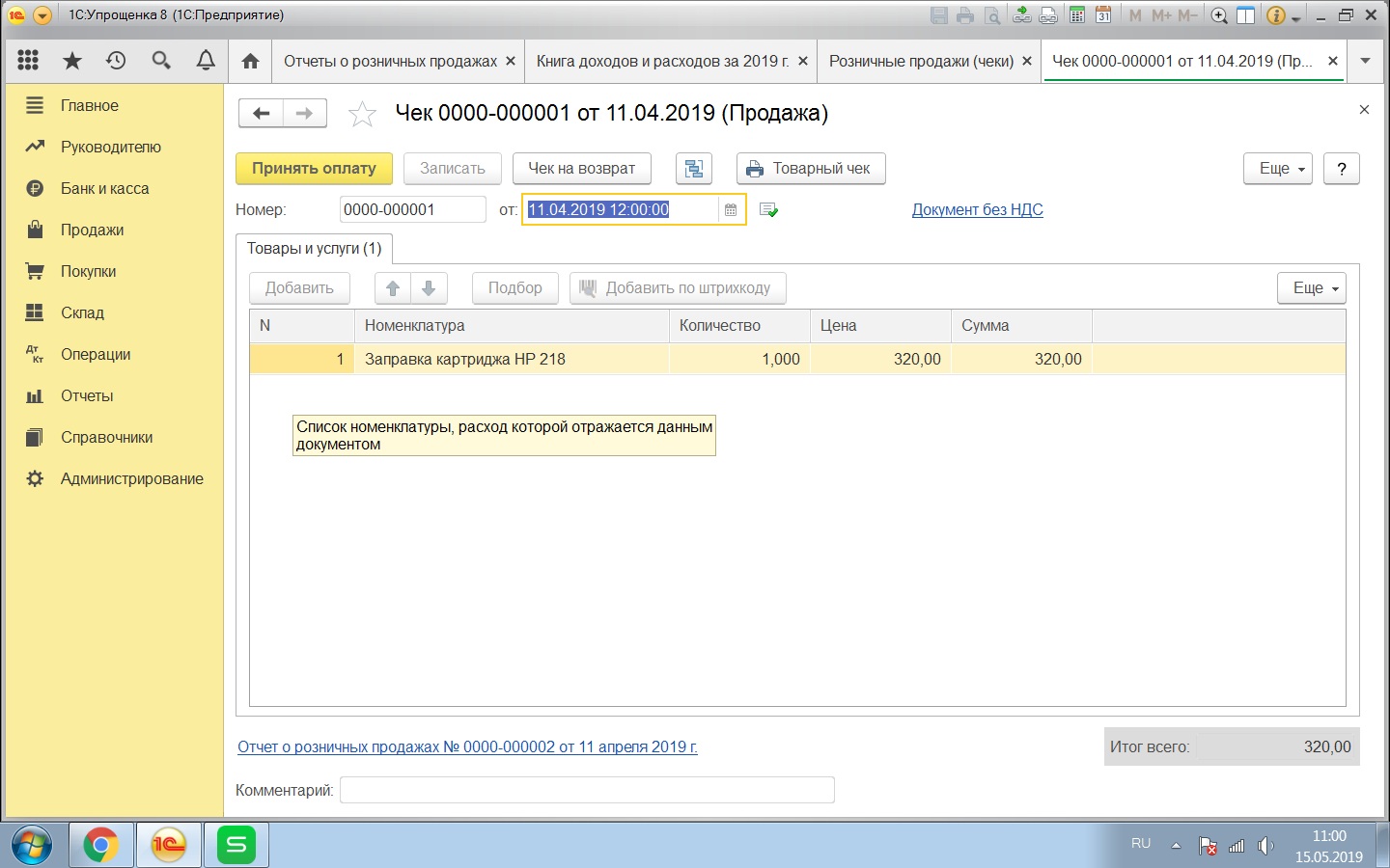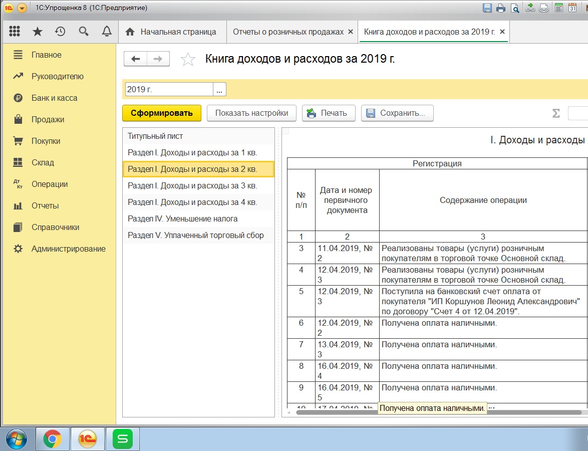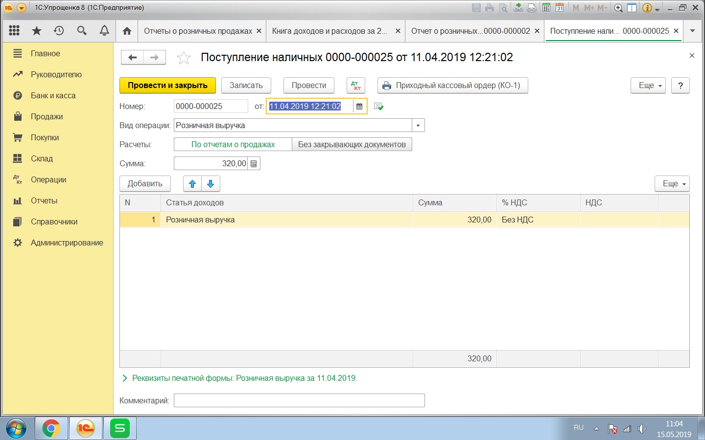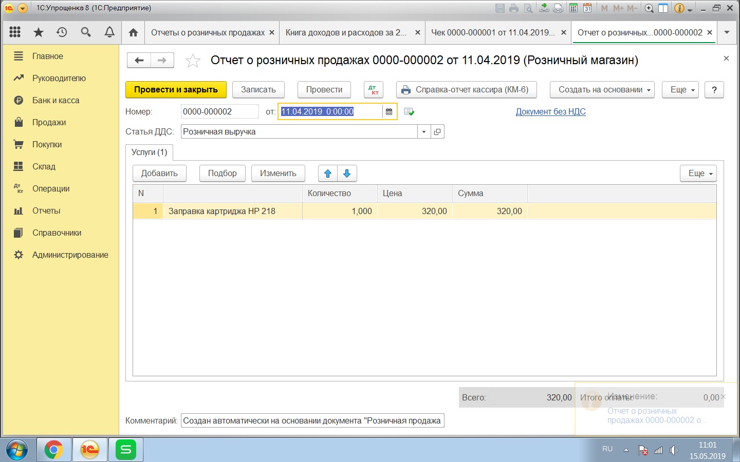 Я создала чек на услуги, например, за первый выданный чек с нашей онлайн кассы от 11.04.19, он автоматически создал отчет о розничных продажах, после того как я нажала закрыть смену, после создала из отчета Поступление наличных, там прописала, что это выручка за услуги, только в КУДиР идет не совсем верная запись, как мне кажется или так и должно быть? (сделала скрин, чтобы не запутать Вас!