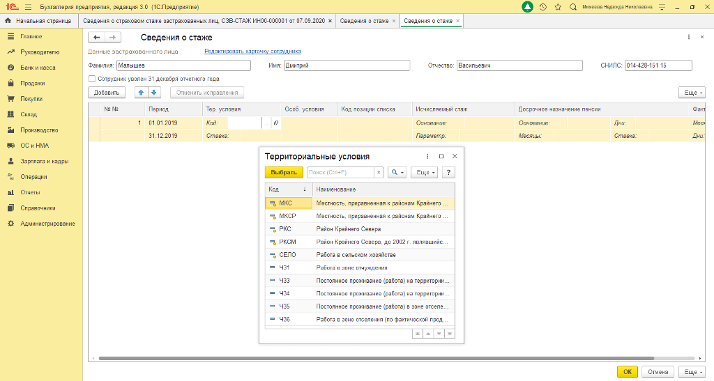 – Как в программе «1С:Бухгалтерия 8» в отчете СЗВ-СТАЖ указать, что работник был принят на полставки? – В общем случае неполный рабочий день включается в страховой стаж работника как полный день. Это значит, что, к примеру, период работы с 01.01.2020 по 31.12.2020 у работника, отработавшего полный рабочий день, и у работника, отработавшего на полставки, увеличит страховой стаж обоих работников одинаково, т.е. на один год. Это означает, что отражение неполного рабочего дня в СЗВ-СТАЖ, когда работа не дает права на досрочную пенсию, не имеет никаких особенностей. Специфика в заполнении СЗВ-СТАЖ при неполном рабочем дне возникает, когда работник трудится в условиях, дающих право на назначение ему досрочной пенсии. Согласно Постановлению Правления ПФ РФ от 11.01.2017 № 3п, существуют два вида условий, дающих право на назначение досрочной пенсии: «Территориальные условия» и «Особые условия труда». В СЗВ-СТАЖ они отражаются следующим образом: