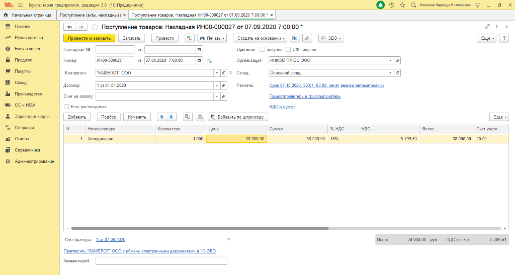Например, если сотрудник трудится неполный рабочий день в местности, приравненной к районам Крайнего Севера и имеет право на досрочный выход на пенсию, то при заполнении СЗВ-СТАЖ в графе 8 «Территориальные условия (код)» указывается значение «МКС 0,5» Для отражения льгот в СЗВ-СТАЖ необходимо создать отчет СЗВ-СТАЖ («Отчеты»-«Регламентированные отчеты»), два раза нажать на строку с сотрудником, как показано на рисунке. Рис.1 После данного действия открывается странница со сведениями о стаже. Здесь можно указать код и ставку территориальных или особых условий. Рис.2 – Организация получила машину по договору лизинга. Данное ОС учитывалось на балансе лизингополучателя. В этом месяце произошла передача прав выкупа третьему лицу. Как это отразить в программе «1С:Бухгалтерия 8»? – Чтобы отразить факт выбытия основного средства, необходимо заполнить документ «Передача ОС» (раздел «ОС и НМА» – «Выбытие основных средств») на данное ОС. Если переданный автомобиль был переоформлен в ГИБДД на нового собственника, то рекомендуется уточнить данный момент в программе таким образом: Открываем вкладку «Транспортный налог» (раздел «Главное» – «Налоги и отчеты»). Переходим по ссылке «Регистрация транспортных средств». Нажимаем кнопку «Создать», в виде операции выбираем пункт «Снятие с учета». Выбираем автомобиль в открывшейся форме, указываем дату снятия с учета в ГИБДД и организацию (если ведется учет по нескольким организациям в информационной базе). Нажимаем кнопку «Записать и закрыть». – Организация приобрела холодильник, стоимость которого менее 40 000 руб. Каким образом его можно принять на учет и как правильно оформить это в программе «1С:Бухгалтерия 8»? – Организация вправе для целей бухучета имущество стоимостью менее 40 000 руб. включить как в состав МПЗ, так и в состав основных средств. При этом в учетной политике для целей бухучета должен быть установлен единый стоимостный критерий для целей отнесения имущества к МПЗ или к ОС. Поэтому, если у вас в учетной политике для целей бухгалтерского учета стоимостный критерий отнесения имущества к ОС не превышает стоимости холодильника, то вы вправе учесть холодильник в составе основных средств. В программе это можно отразить следующим образом: Вариант 1. Отнесение имущества в состав МПЗ. В данном случае холодильник будет принят как хозяйственный инвентарь и будет учтен на 10.9 счете. Поступление имущества оформляется документом «Поступление товаров». Рис. 3 Далее создаем документ «Передача материалов в эксплуатацию», чтобы списать стоимость холодильника. Рис.4 Вариант 2. Отнесение имущества в состав ОС. В этой ситуации учет холодильника будет вестись на счете 01. В программе покупка будет отражена документом «Поступление основных средств» (раздел «ОС и НМА» – «Поступление основных средств»). Рис. 5 |
