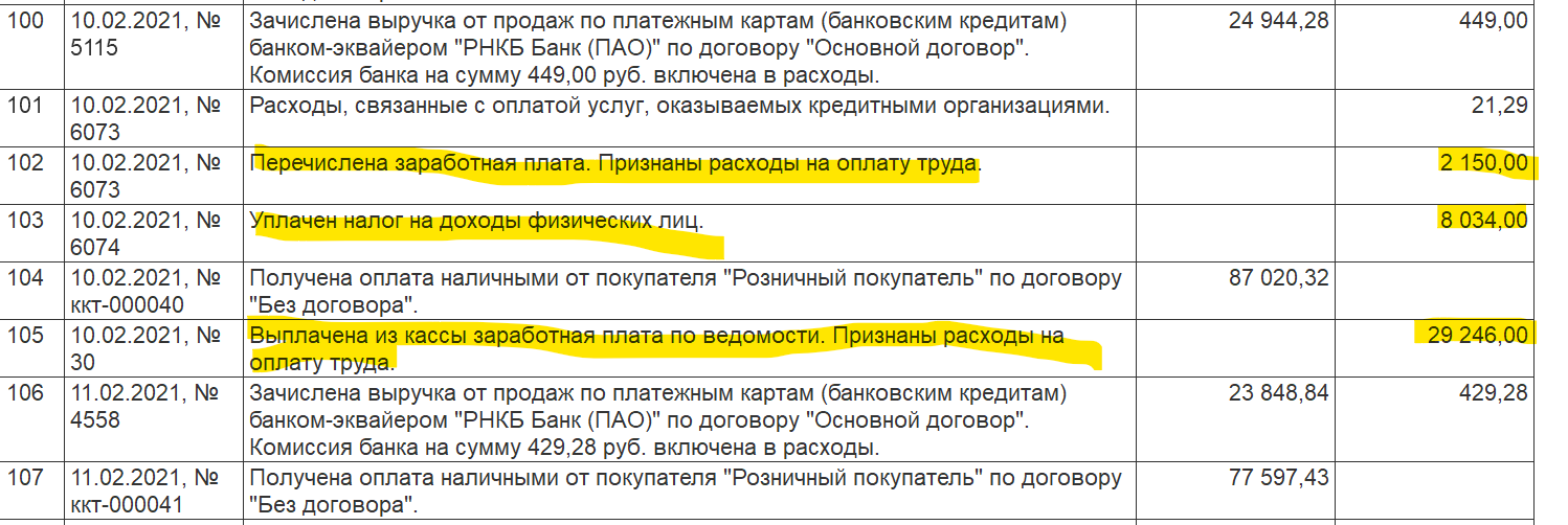 Например, вот так у меня отражена в КУДИРе выплаченная в феврале зарплата за январь и перечисленный в этот же день НДФЛ.
