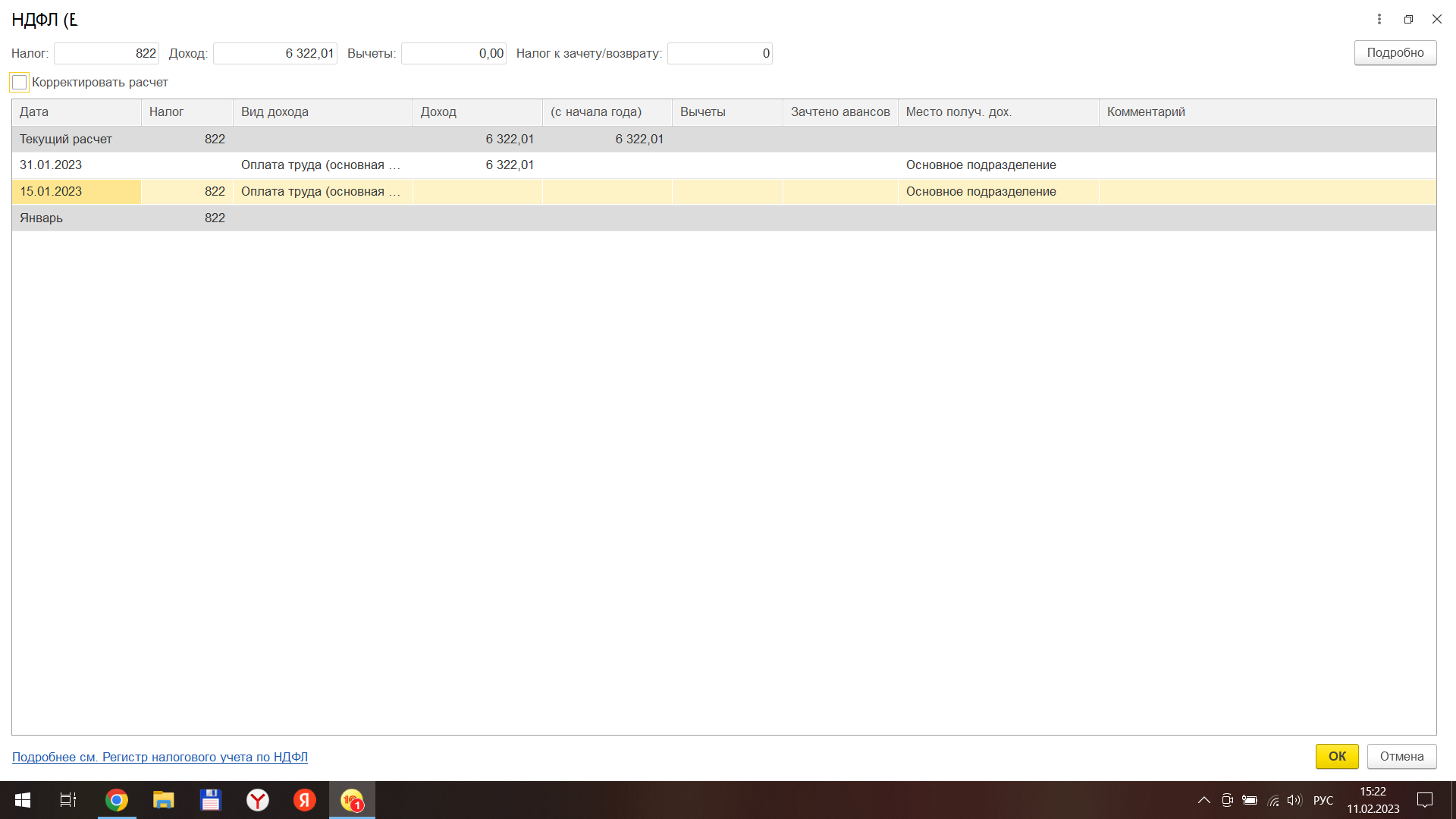 Я сейчас исправила даты в настройках на 15-аванс, 1 -з/плата.(1 числа месяца следующего за расчетным) Заново все сформировала и провела. НДФЛ в ведомости на аванс теперь считает правильно, но в регистре НДФЛ выдает еще дата получения дохода 01.02.2023 и сумма с минусом 822 (дату видимо берет с настроек).Нет же такой возможности в настройках вообще не указывать даты?