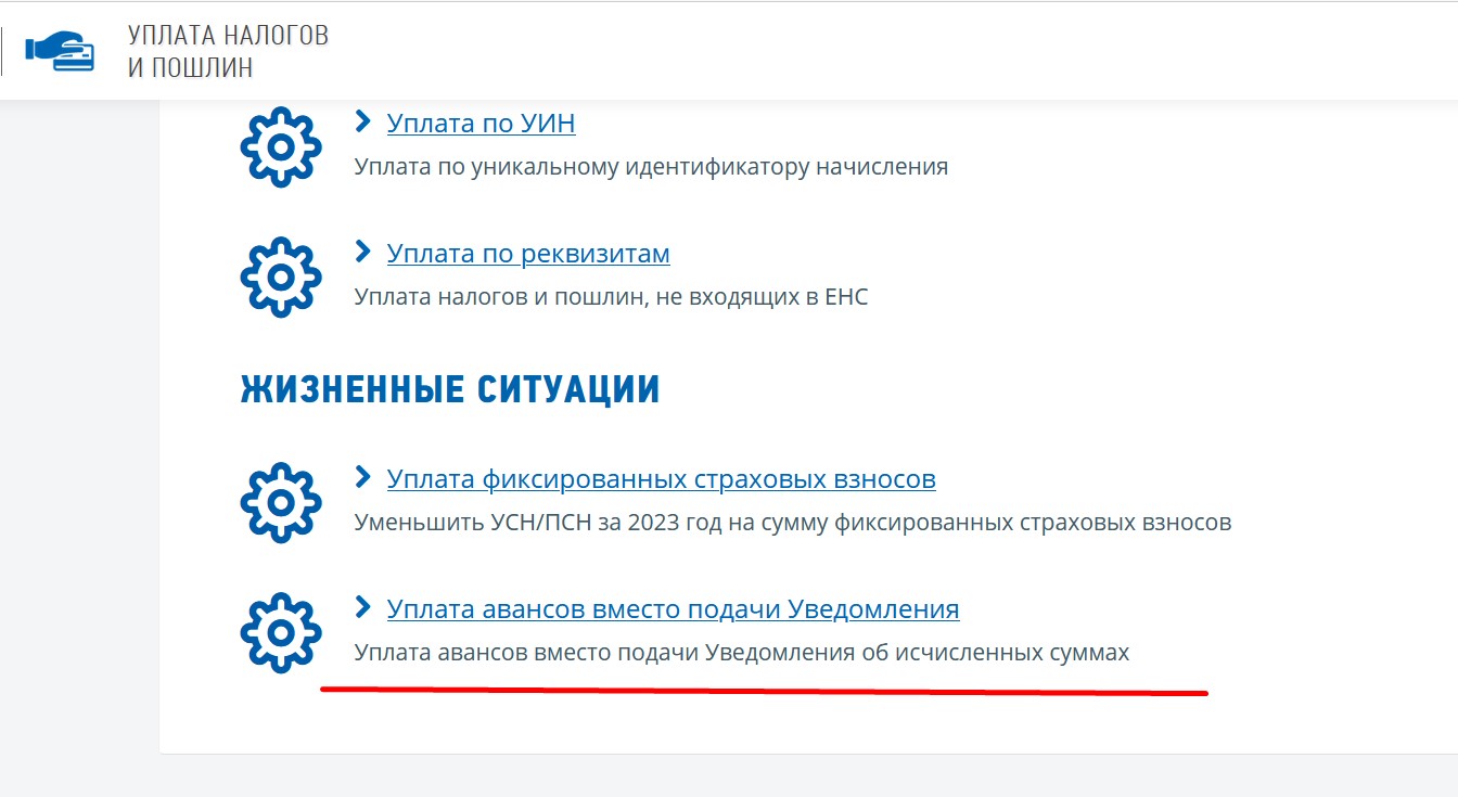 nalog.ru в разделе Уплата налогов и пошлин/Уплата авансов вместо подачи уведомления об
