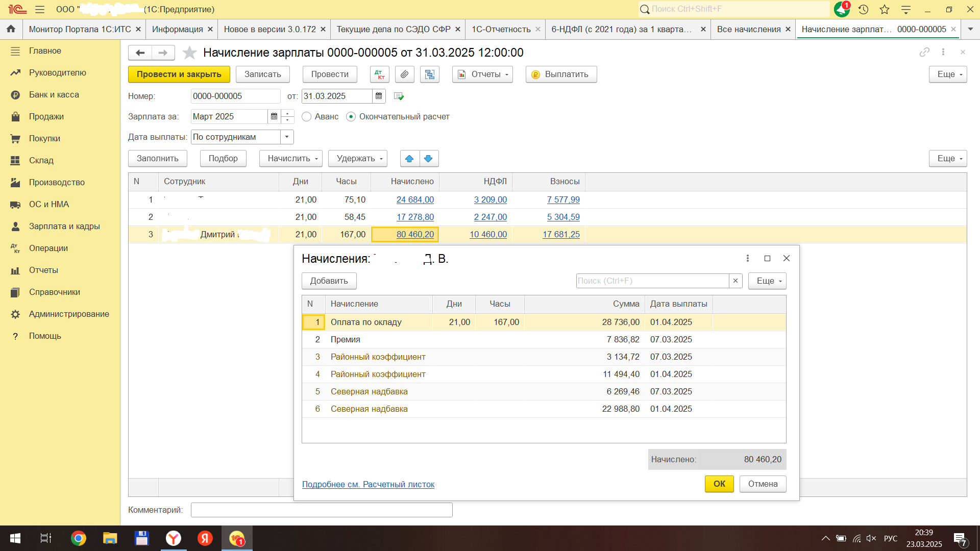 1С:Предприятие 8.3 (8.3.26.1498) Бухгалтерия предприятия (базовая), редакция 3.0 (3.0.172.24) У нас есть районный коэффициент и северная надбавка. Аванс за март не выплачивался, была выплачена премия за март - 07.03.2025. Я сделала в программе начисление за март датой 31.03.2025. начислила премию 7836,82, РК и СН начислился автоматом в строки РК и СН,которые идут для оклада. Так как зарплата будет выплачиваться отдельно от премии, позже, то мне надо было сделать отдельно строки РК и СН для премии. Я скопировала строки РК и СН и вручную их перезаполнила. Оплата по окладу : 28736 дата выплаты 01.04.2025 премия 7836,82 дата выплаты 07.03.2025 РК 3134,72 дата выплаты 07.03.2025 РК 11494,4 дата выплаты 01.04.2025 СН 6269,46 дата выплаты 07.03.2025 СН 22988,80 дата выплаты 01.04.2025 Зарплата за март не выплачена, выплачена только премия 7836,82 + РК3134,72+СН 6269,46=15000 Р. Формирую 6-НДФЛ за 1 кв.2025 год и во 2 раздел попадает Оплата по окладу : 28736, РК 11494,4, СН 22988,80, то есть невыплаченная зарплата. Помогите,пожалуйста,разобраться. По другим сотрудникам что не выплачено, то и не попадает,все хорошо. |