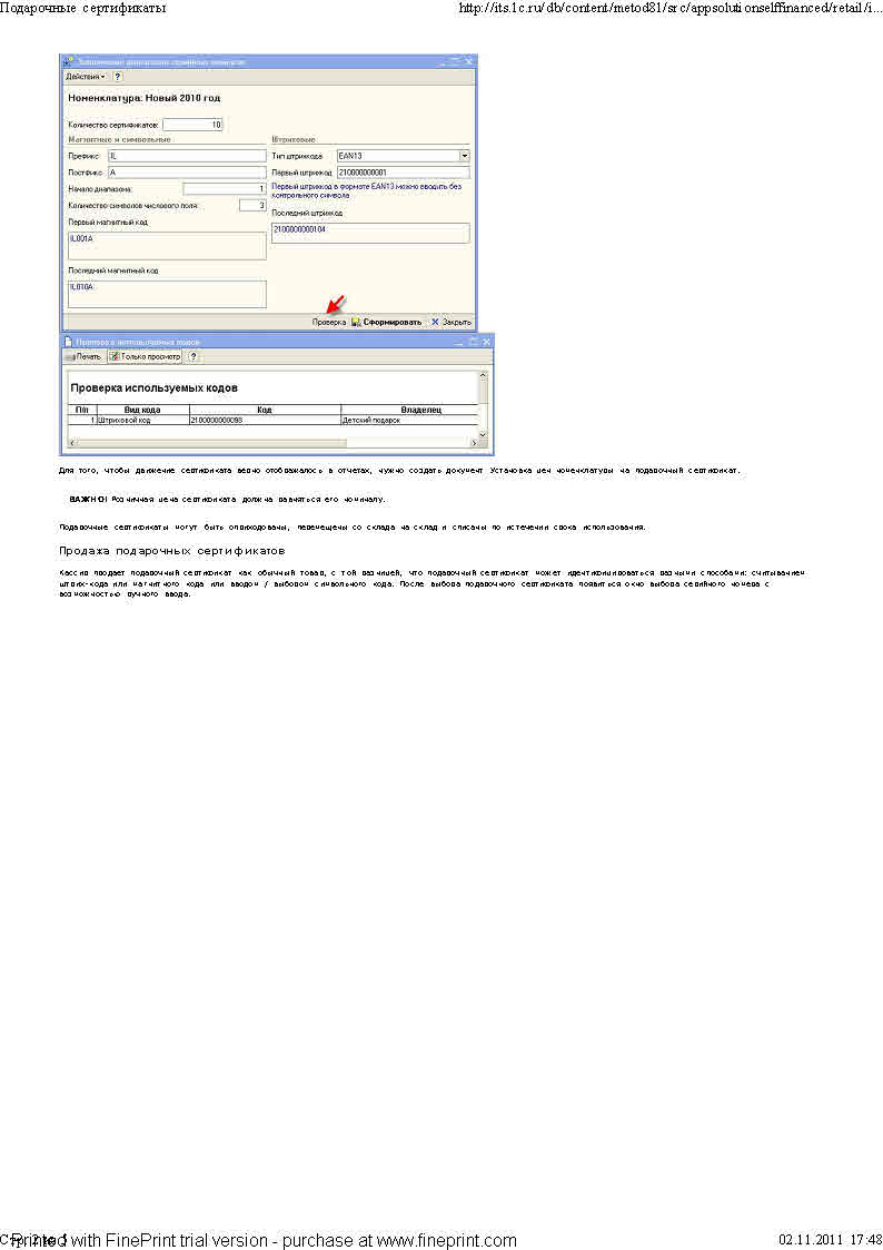 Ситуация в следующем. Хотим в магазине ввести подарочные сертификаты. Но я пока не понимаю как это проводить по программе. По кассе все понятно, при продаже ПС к примеру номиналом 1000 руб. покупателю выбиваем чек. Пришел счастливый обладатель сертификаты и купил товар к примеру на 1100 руб. Соответственно 1000 уже была оплачены, с покупателя нужно взять всего 100 руб, но чек выбить на общую сумму, 1000 по особой секции, которая нужна лишь для учета товара, т.е. эта сумма не попадет в гросситог, и 100 по обычной секции. Интерессно как списывать товар если его стоимость по учету 1 100, каким образом нужно настроить отчет о продажах чтобы аванс засчитывался при продаже?