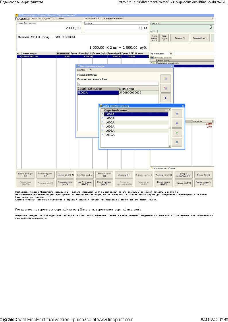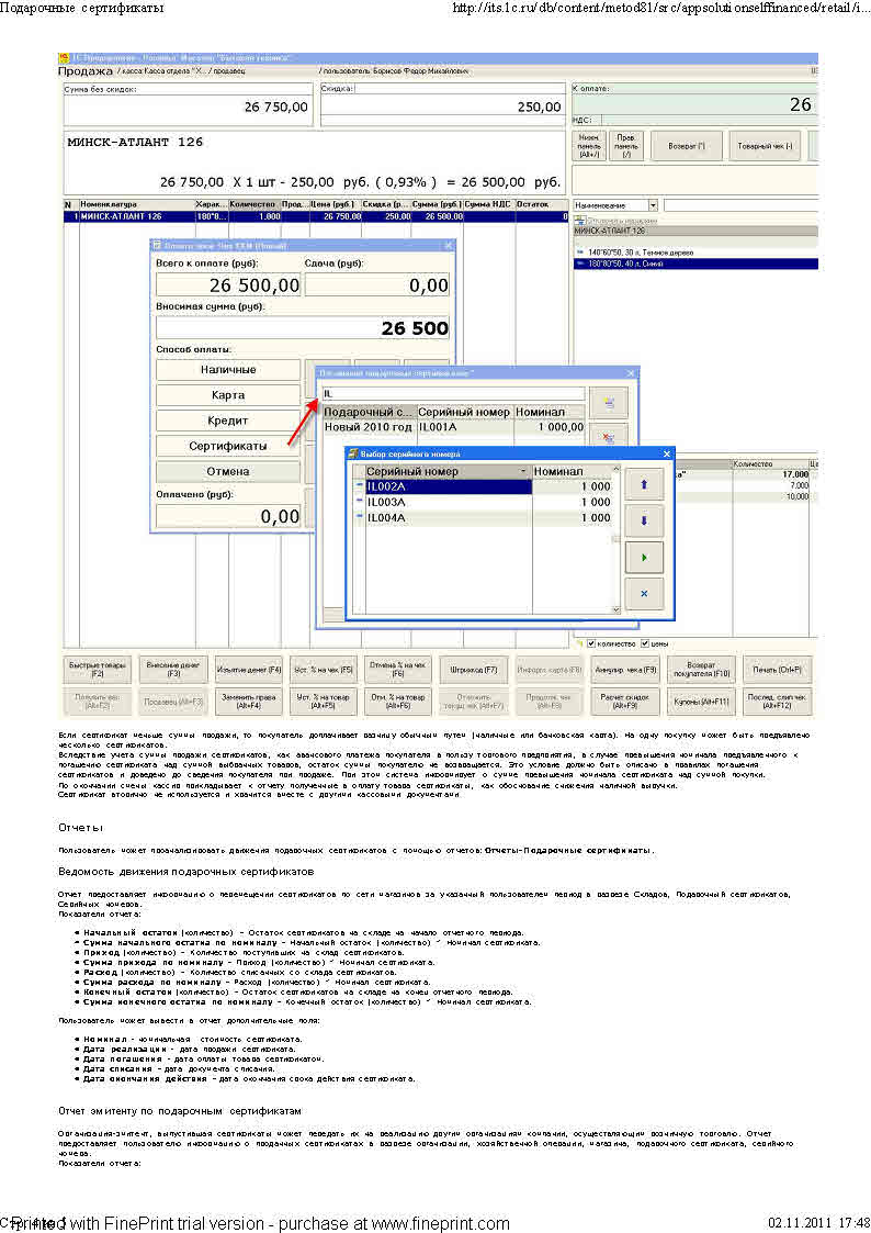 А каким образом это автоматизированно в рознице, можете обьяснить на примере? К примеру сертификат на 1000 руб, а товар стоит 1500р.Как это будет выглядеть в программе?