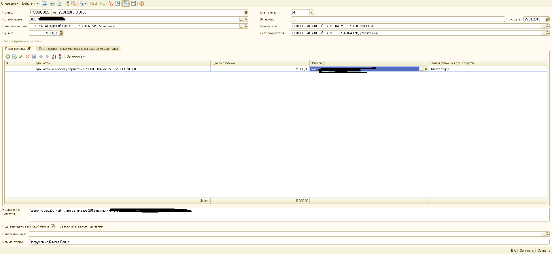 Elee, Я выплачиваю зарплату через банк, каждому сотруднику отдельно на их карты, не по зарплатному проекту, ничего дополнительно не вводила, при проведении выписки, вот как выгрузила из банк-клиента так выписка и выглядит, но когда каждую платежку по сотруднику провожу, то выбираю там где подцепляю ведомость на выплату зарплаты в колонке Физ.лицо сотрудника которому выплачивается зарплата из справочника физ.лица, ведь изначально, когда мы делаем приказ о приеме на работу, то сначала заполняем данные физ.лица.