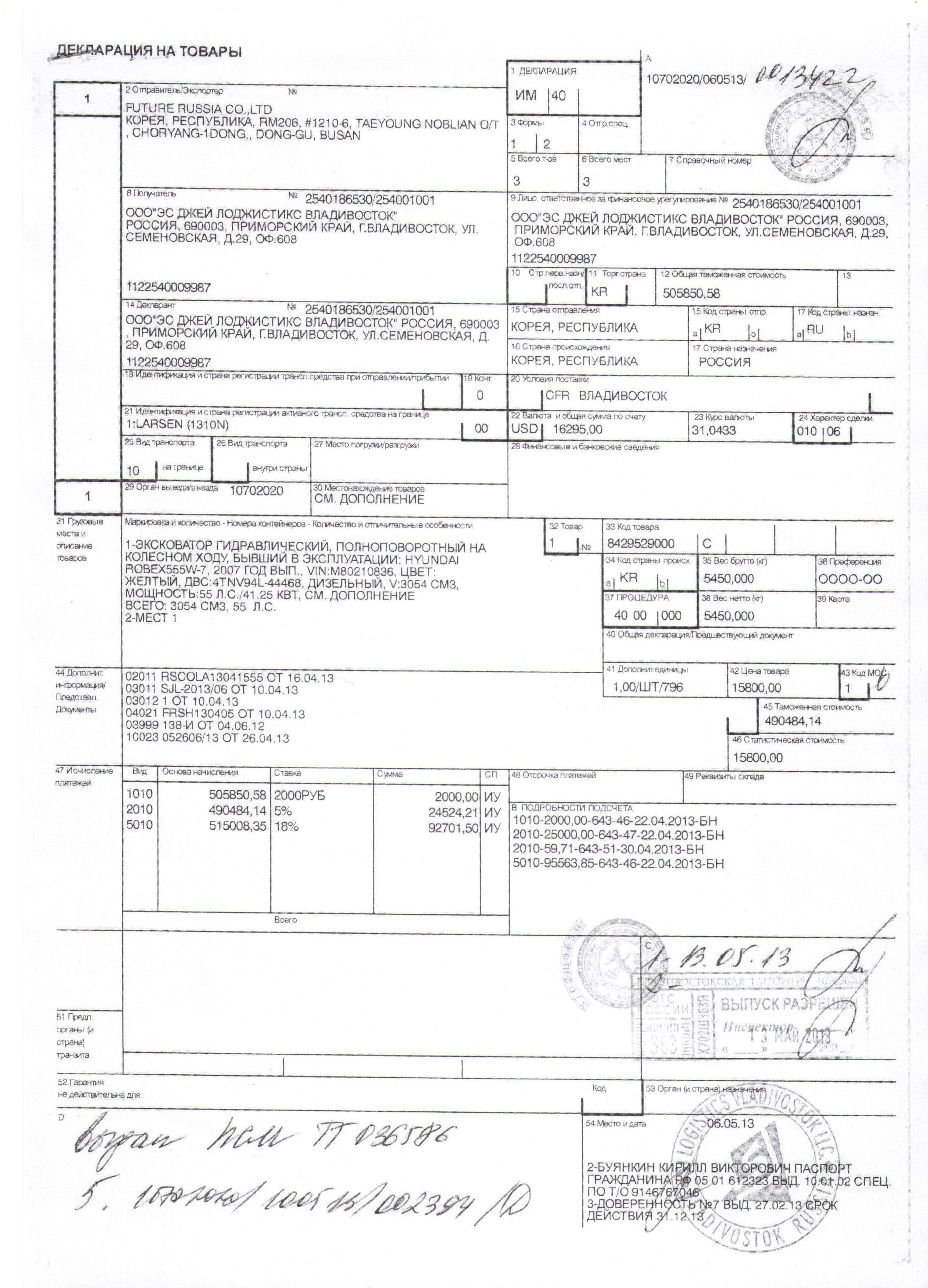 Здравствуйте. Подскажите пожалуйста, как правильно учесть в 1С: Предприятие 8.2 (8.2.18.82) импортный товар? Из Южной Кореи пришел Экскаватор гидравлический, заявленная декларантом таможенная стоимость составила 490 484,14 руб. В первом листе декларации на товары указан Экскаватор гидравлический, полнопоротный на колесном ходу, таможенная стоимость 490 484,14 руб.. В стр. 47 "Исчисление платежей" указаны следующие суммы: вид 1010, Основа начисления 505 850,58 руб., ставка 2000 руб., сумма 2000 руб. Вид 2010, основа начисления 515008,14, ставка 5%, сумма 24524, 21. Вид 5010, ставка 18%, сумма 92701,5.
