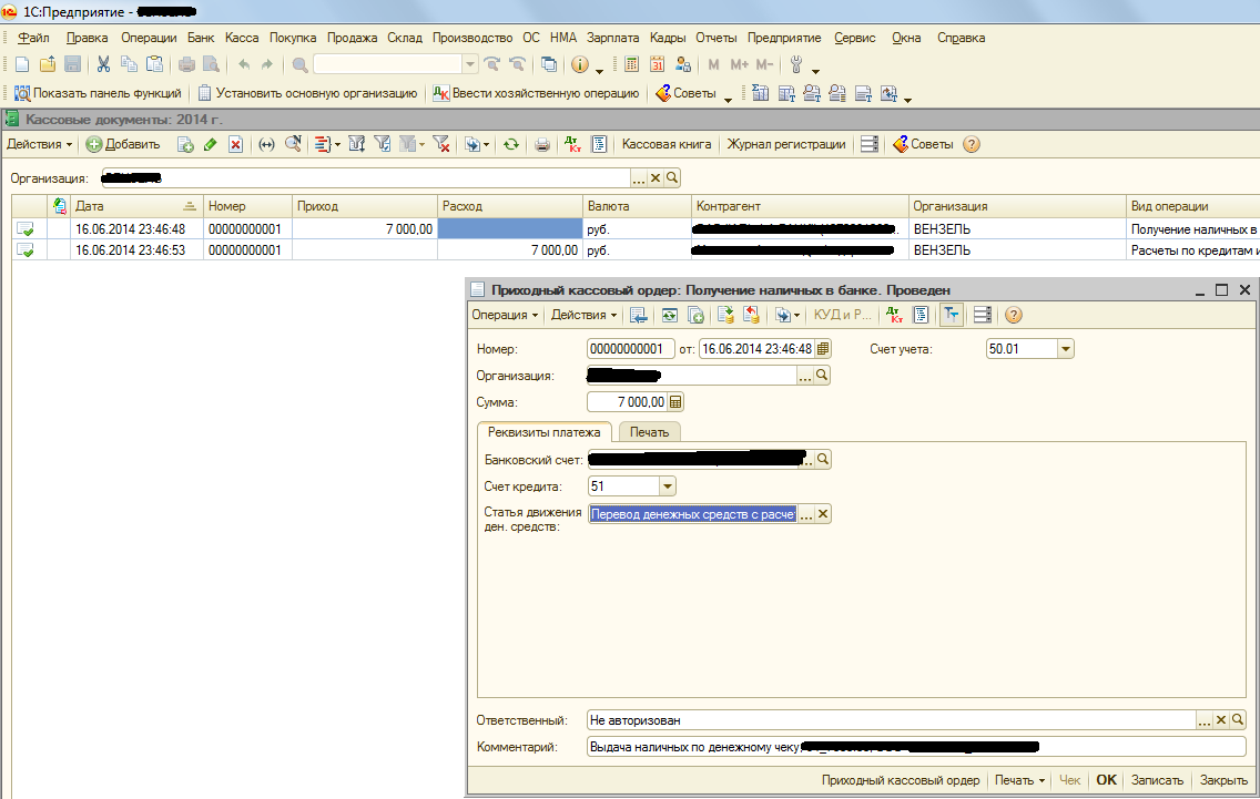 2). 16.06.2014 состоялось погашение займа. В банке Директором были сняты наличные средства (7 тыс.руб.) и внесены в кассу для выдачи их Учредителю. В 1С: ПКО с видом операции "Получение наличных в банке", проводка Дт 50 Кт 51. Статья ДДС: "Перевод денежных средств с расчетного счета в кассу для погашения задолженности перед учредителем".