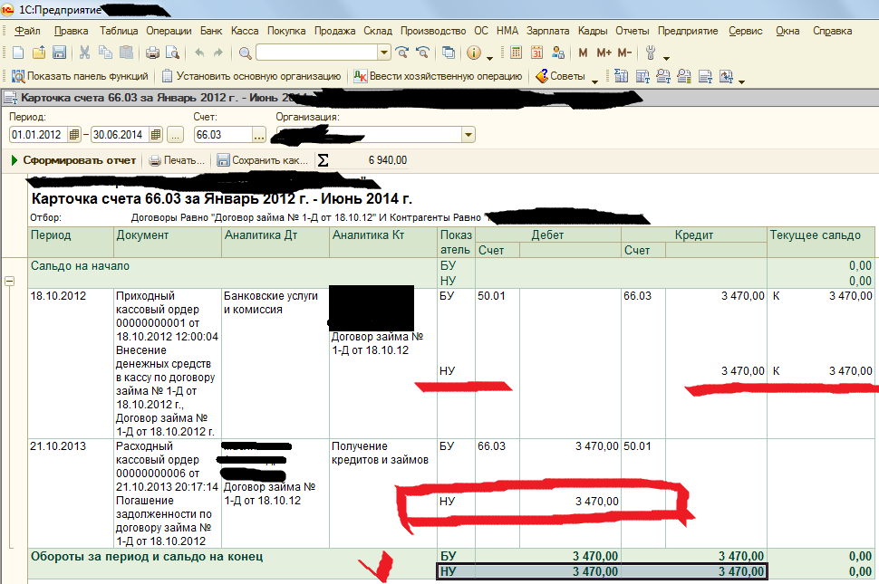 Потом поступление отразила через приходный кассовый ордер (Дт 50 Кт 51, банк сошелся, но (!) Директора там выбрать нельзя, т.к. я выбрала вид операции «Получение наличных в банке» (см. файл «ПКО»). Затем был сформирован расходный кассовый ордер (из кассы выдали учредителю деньги) –Дт 66 Кт 50 (выбран учредитель), но по счету 66 БУ закрылся, а НУ не хочет. Уже и время проверяла, и статьи, и получателя