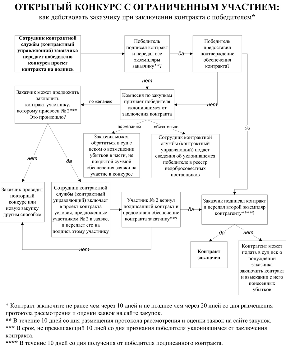 Основное отличие конкурса с ограниченным участием от обычного открытого конкурса в том, что его участники проходят предварительный предквалификационный отбор. Победителем становится тот, кто будет соответствовать дополнительным требованиям и направит заявку с лучшими условиями контракта (ч. 1 ст. 56 Закона от 5 апреля 2013 г. № 44-ФЗ). Условия проведения конкурса с ограниченным участием Конкурс с ограниченным участием проводите при закупке товаров (работ, услуг), если: • требуется особый уровень квалификации поставщика по причине технической или технологической сложности (инновационного, высокотехнологического или специализированного характера); • работы связаны с сохранением и реставрацией объектов культурного наследия (памятников истории и культуры), музейных предметов и коллекций, особо ценных и редких документов; • для выполнения работ требуется допуск участника закупки к учетным базам и системам безопасности музеев (в т. ч. хранилищ), архивов, библиотек. Об этом сказано в части 2 статьи 56 Закона от 5 апреля 2013 г. № 44-ФЗ. Внимание: проводить конкурс с ограниченным участием можно, только если Правительством РФ установлены дополнительные требования к участникам и перечень документов, подтверждающих соответствие установленным требованиям. Однако независимо от того, установлены Правительством РФ дополнительные требования или нет, заказчик вправе провести закупку любым другим способом. В этом случае применять дополнительные требования к участникам нельзя. Об этом сказано в части 2.1 статьи 56 Закона от 5 апреля 2013 г. № 44-ФЗ и разъяснено в совместном письме от 21 февраля 2014 г. Минэкономразвития России № 3422-ЕЕ/Д28и и ФАС России № АЦ/6139/14. Так, например, под проведение конкурса с ограниченным участием попадет закупка услуг общественного питания или поставка пищевых продуктов для образовательных, медицинских учреждений. Полный Перечень случаев, когда предмет закупки относится к технически и технологически сложному (инновационному и специализированному), утвержден постановлением Правительства РФ от 4 февраля 2015 г. № 99. Подготовка к проведению Подготовка к проведению конкурса с ограниченным участием ничем не отличается от подготовки к открытому конкурсу. Извещение о закупке и конкурсную документацию разместите на официальном сайте () в том же порядке, который нужно соблюдать при проведении открытого конкурса. Единственное отличие на этапе подготовки этих конкурсов заключается в содержании извещения о закупке и конкурсной документации (ч. 3, 4 ст. 56 Закона от 5 апреля 2013 г. № 44-ФЗ). Извещение о закупке, конкурсная документация При проведении конкурса с ограниченным участием в извещении о закупке и конкурсной документации нужно указать как единые, так и дополнительные требования к участникам. Важно, что дополнительные требования применяются только для предквалификационного отбора и не могут использоваться для оценки заявок. При этом дополнительные требования к участникам закупки вправе устанавливать только Правительство РФ. Закон от 5 апреля 2013 г. № 44-ФЗ предусматривает, что Правительство РФ может устанавливать дополнительные требования к наличию: • финансовых ресурсов; • оборудования и других материальных ресурсов; • опыта работы и деловой репутации; • необходимого количества специалистов требуемой квалификации. Так