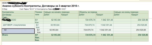 Здравствуйте! БП 3.0. Среди сотен покупателей один "садится" с краснотой по 62. Учет ВСЕГДА и у ВСЕХ велся без разреза документов, договор только один, корректировок\зачетов\возвратов нет. В выписках распределение "автоматически". Если разбить в ручную деньги, то становится без красноты, но только до следующей выписки. Анализ субконто прилагаю, ошибка - сальдо 62.1 кредитовое. Перепроведение как общее, так и по контрагенту не дает эффекта. Виновата прокладка или 1с?