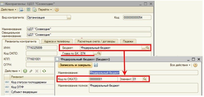 Реквизиты «Код по ОКАТО» и «Элемент» – графы 3 «Код по ОКАТО» и 4 «Код элемента бюджета справок по консолидируемым расчетам указываются в элементе справочника «Бюджеты», выбранном для «Контрагента» в реквизите «Бюджет».