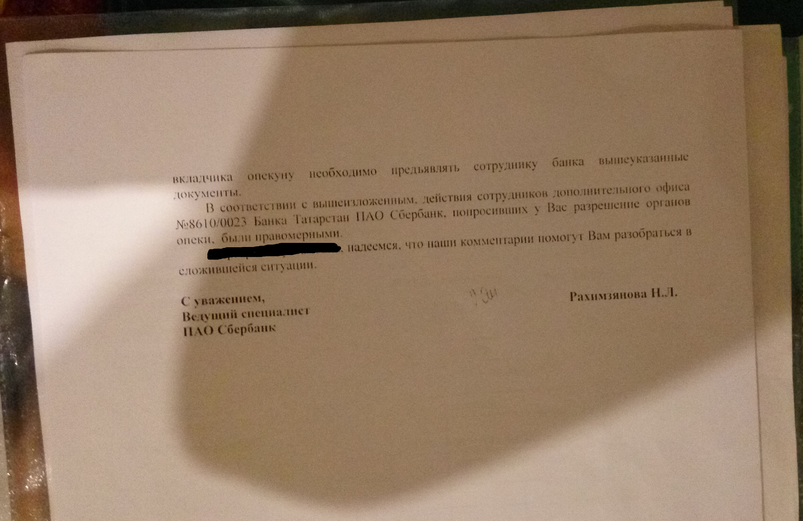не всех, персонал в виде руководителя отделения и оператора тупо выполняют внутренний регламент (на него они и ссылаются), а вот некая "Ведущий специалист" Н.Л.Рахимзянова - та, да (вообще говорили, что отдадут юристам, судя по всему этот неуч и есть юрист. Судя по материалам в сети, со сбербанком есть такая проблема, поэтому нужна судебная практика, чтобы раз и на всегда прекратить беспредел сбера).