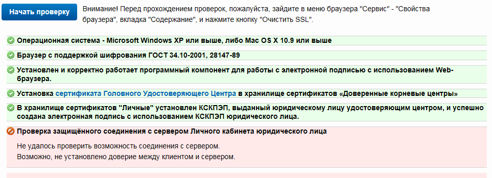 Всё стопорится на последнем пункте "Проверка защищённого соединения с сервером Личного кабинета юридического лица" Если не удалось установить защищенное соединение... (Нажмите, чтобы развернуть справку)Попробуйте перейти в Личный кабинет юридического лица по прямой ссылке .
