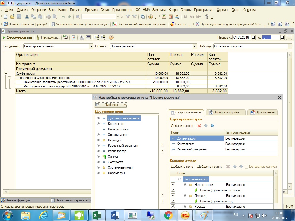 Lala, надо смотреть в Отчеты/ Прочие/ Универсальный отчет. Сформировать 2 варианта, настройки в файлах. В отчете "Прочие расчеты" установить отбор Счет учета=70. В другом Вид расхода=Зарплата