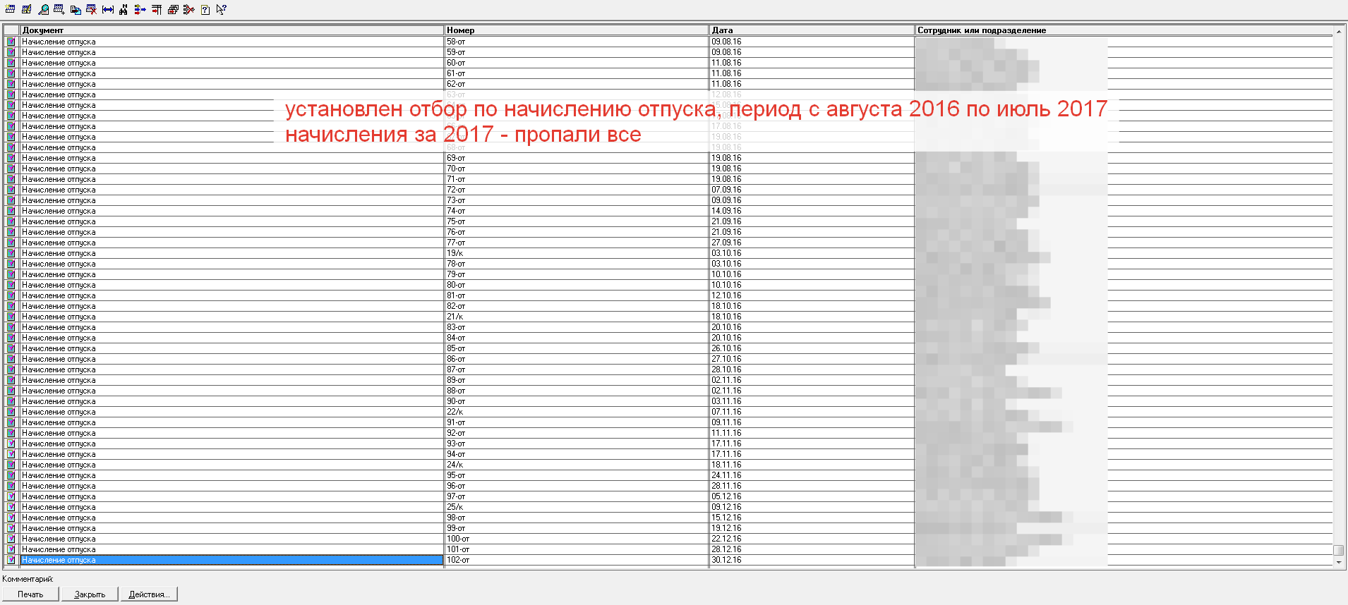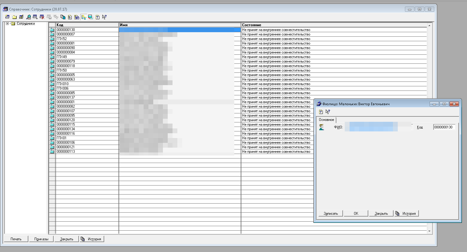 Обновили ЗИК 7.7 до 7.70.365, на выходе получали поломанную базу. Пробовали множество раз, в итоге получается две ситуации (либо 1 либо 2): 1. Карточки сотрудников пустые (только ФИО и КОД остались), в справочнике сотрудников все сотрудники в состояниии "Не принят на внутреннее совместительство". До обновления те же сотрудники с заполненными карточками, принятые в штат, всё как положено. 2. Вторая ситуация - пропали документы начислений за 2017 год (зарплаты, отпусков, страховых взносов - все). За предыдущие года документы начислений остались, а за 2017 - исчезли. Как быть, что делать, перерыл пол-интернета, не нашел. Помогите, коллеги, прошу! |