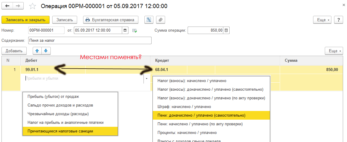 Или вы имеете ввиду просто выбрать из списка чтобы в низу было подписано под счетом 99.01.1 причитающиеся налоговые санкции, а под 68.04.1 пени до начислены, уплачены