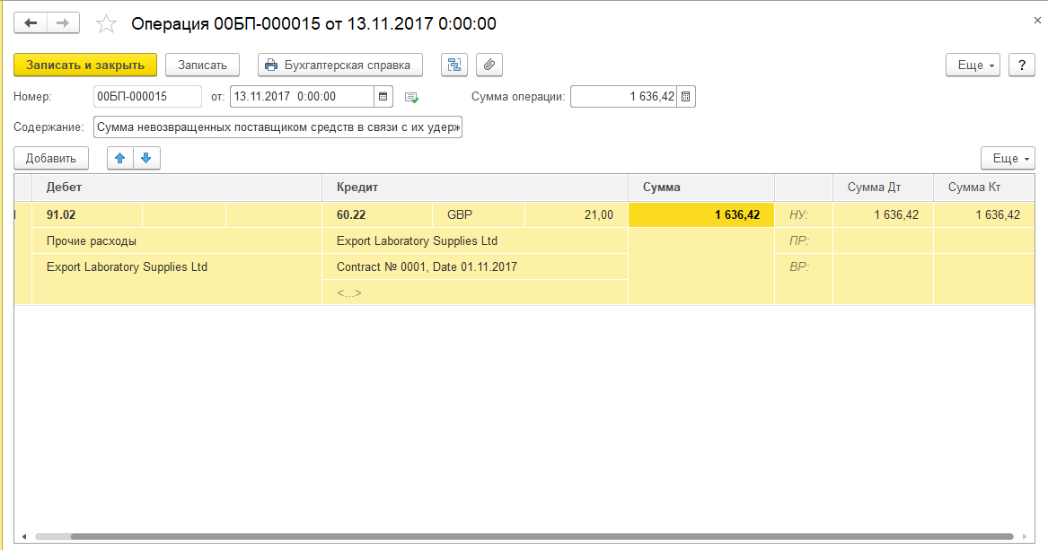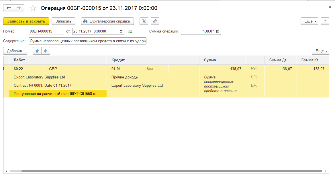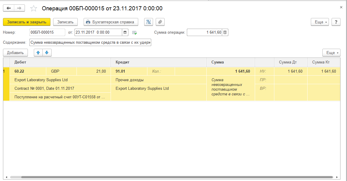 Оплачивали поставщику в валюте, но оплата не прошла и деньги вернулись на транзитный счет уже за минусом комиссии. Я все это дело оформляю как возврат от поставщика, но проблема в том, что сумма которая вернулась меньше чем была изначально и эту разницу я закрываю бух справкой как "Сумма невозвращенных поставщиком средств в связи с их удержанием банками" (во сложении операция), но рубли закрываются, а фунты нет (во вложении оборотка).