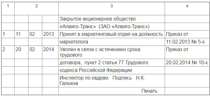 Если запись в трудовой книжке при приеме по срочному трудовому договору не должна отображать временный характер работы, то в записи об увольнении по причине окончания срока работы этот факт обязательно должен быть отражен.